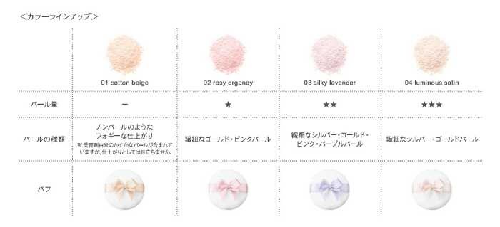 汗や水にも強く、つけたての美しさが持続。ナチュラルからツヤまで好みで選べる4色展開で、それぞれのカラーに合わせたリボン付きパフもポイントです。