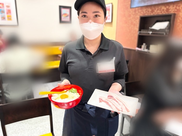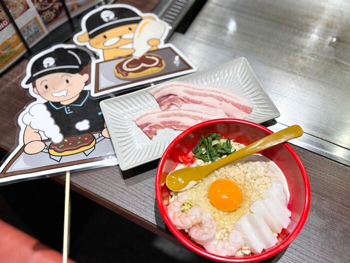 西梅田にちなんだメニューも登場!店舗限定メニュー「西梅田焼」。表面には、ふわりとした玉子が貼り付けられており、中には切りもち・国産豚バラ・イカ・エビ・タラシート、ふっくら食感でボリューム満点。