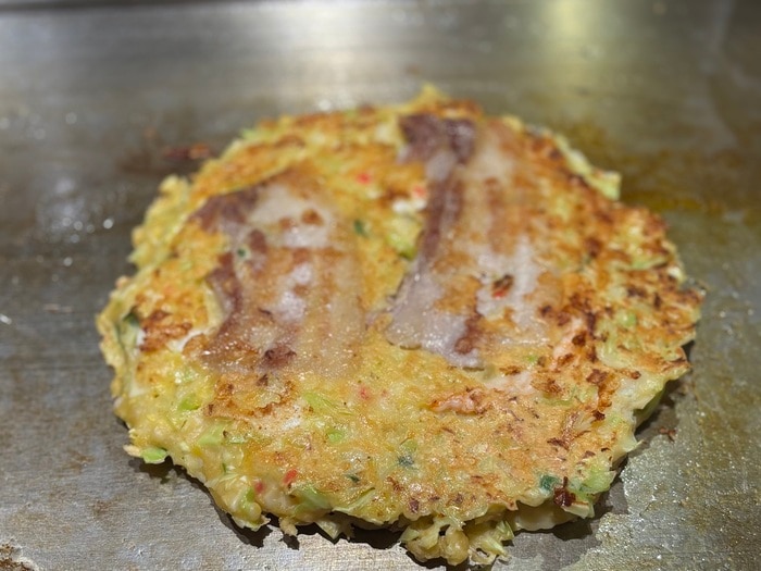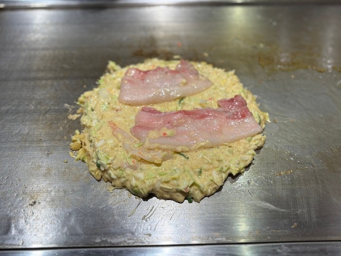 具材が綺麗に混ざると、熱々の鉄板へ。丸く乗せてゆき、最後に豚肉を上に乗せて、中火で約2分焼きます。