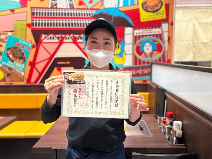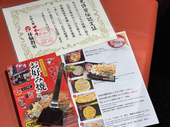 お好み焼体験教室に参加すると、認定書が贈呈されます。お土産には、約5人前作れるお好み焼セットと、コテがついているので自宅で何度もお好み焼を作る際にも役立つので嬉しい!