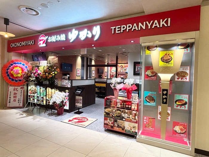 創業76年老舗お好み焼ゆかり。「ゆかり」という名前には、人と人を結ぶ“ご縁”を大切にしたいという想いから生まれたそうで、その想いを象徴するのが、金のコテ。あなたに素敵なご縁が訪れますように…と、幸せが訪れるフォトスポットとして入口で皆さまを出迎えてくれます。