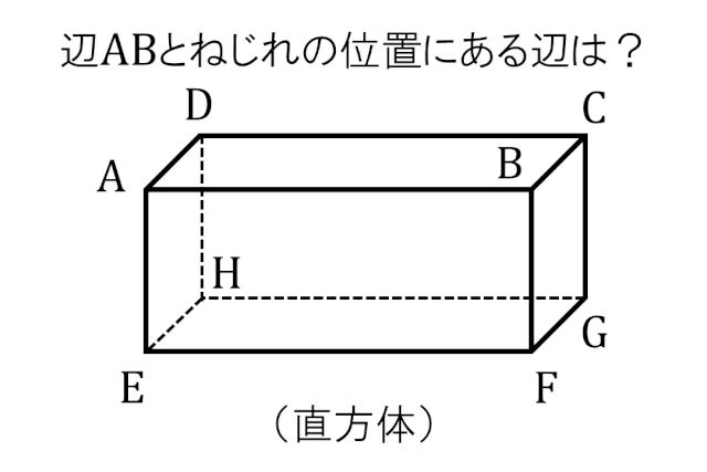 【答】 辺DH、辺CG、辺EH、辺FG空間中の2直線の位置関係は、「交わる/交わらない」の他に、「同じ平面上にある/同じ平面上にない」に注目します。2直線が交わる場合は必ず同じ平面上にあります。2直線が交わらず、かつ同一平面上にあれば「平行」。2直線が交わらず、かつ、同一平面上になければ「ねじれの位置にある」と表現します。辺ABと「ねじれの位置」にある辺、つまり「同一平面上になく、かつ、交わらない辺」を数えればよいわけです。