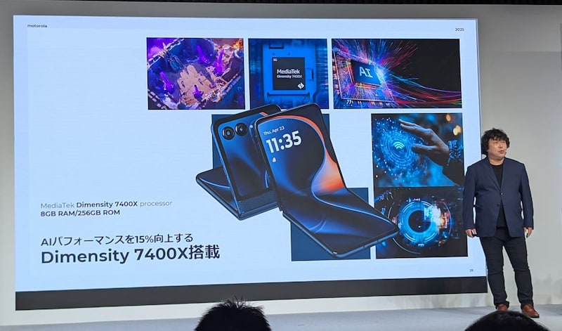プロセッサーにはMediatek DImensity 7400Xを搭載し、AIパフォーマンスを15%向上。razr60は12GB RAMと512GBストレージ、razr60s/razr60dは8GB RAMと256GBストレージを搭載します。