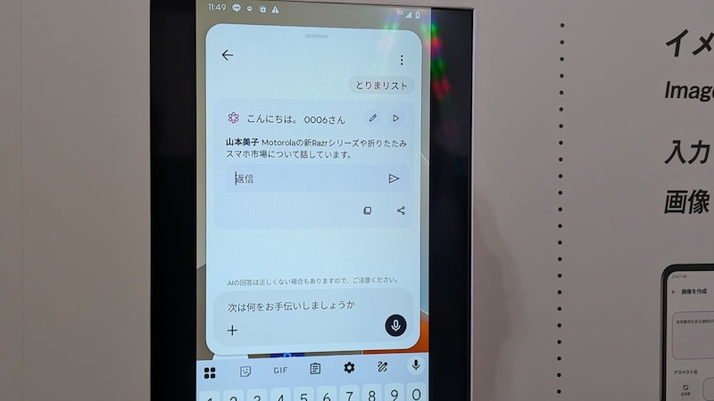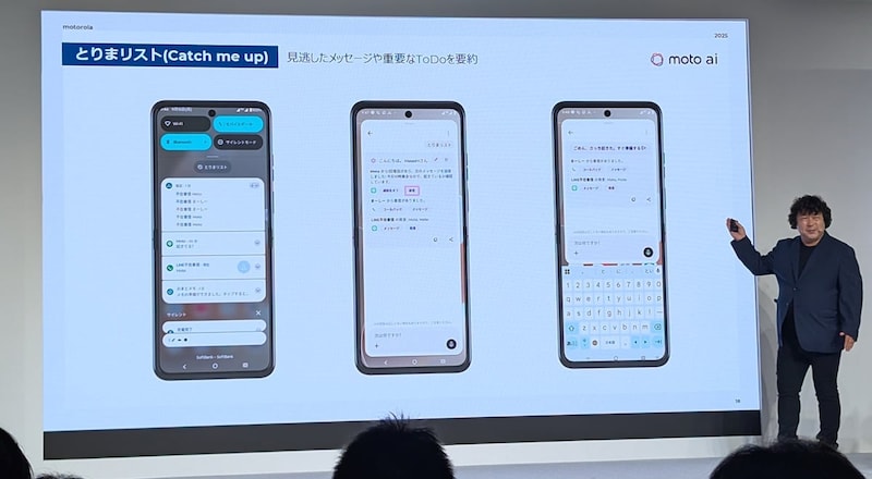 moto aiの新機能には、大胆な日本語名にローカライズしているものも。「とりまリスト(Catch me up)」は、複数の通知に埋もれて見逃したメッセージの要約や重要なToDoの要約を生成する機能。LINEに返信する場合は、LINEアプリを開かなくても“とりまリスト”からそのまま返信することができます。