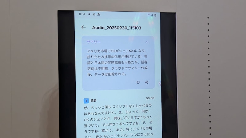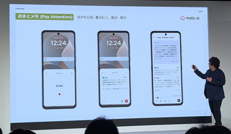 「おまとメモ(Pay Attention)」は、音声を記録して文字起こしや翻訳、要約が利用できる機能。言語設定を日本語にしておくと、日本語と英語が混ざった会話でも録音後にはすべて日本語に翻訳して文字起こしや要約が利用できます。