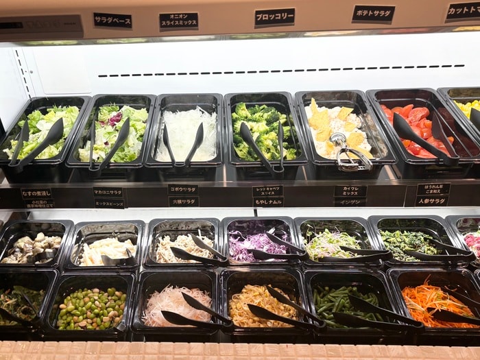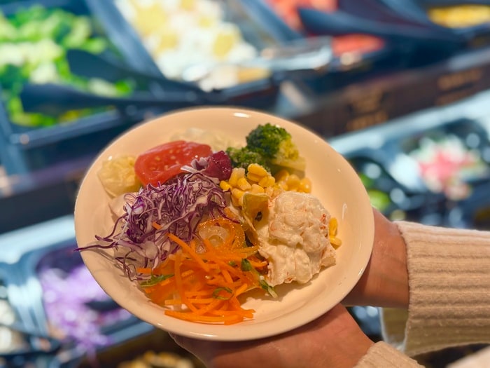 広々とした店内には、色とりどりのサラダバー、フレッシュなサラダに、フルーツやデザートまで、なんと45品!ドレッシングの種類も豊富で何度もおかわり自由。