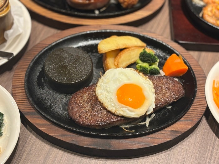 熱々の鉄板で提供するあさくまステーキ