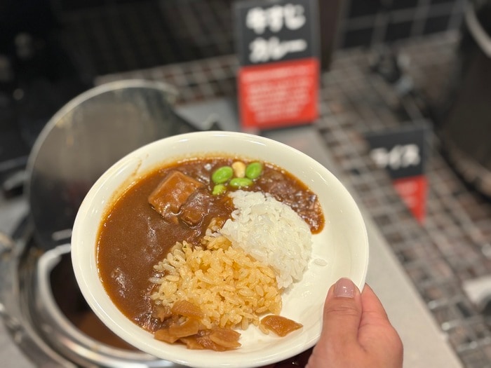 サラダバーに常備されている「牛すじカレー」。ガーリックライスとライスで、お米を2種類で盛り付け、牛の旨みが溶け込んだカレーは必ず食べてほしいメニューです。