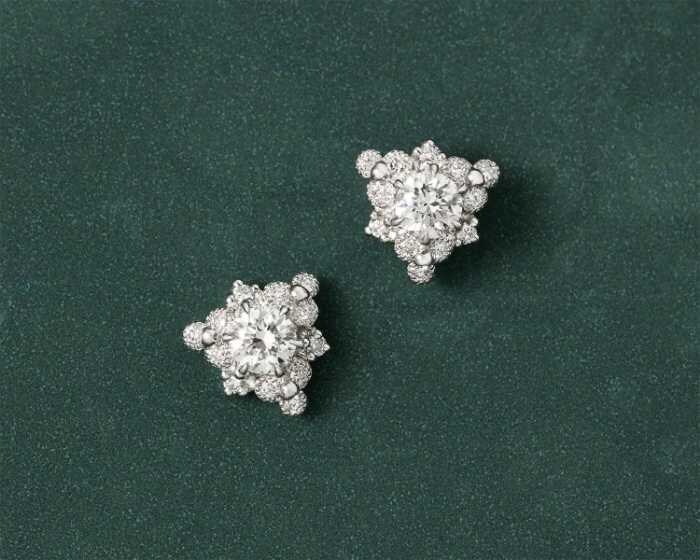 **Pt Diamond Pierced Earrings(374,000円)**は、小花のように煌めくダイヤモンドとセンターストーンの調和が印象的。