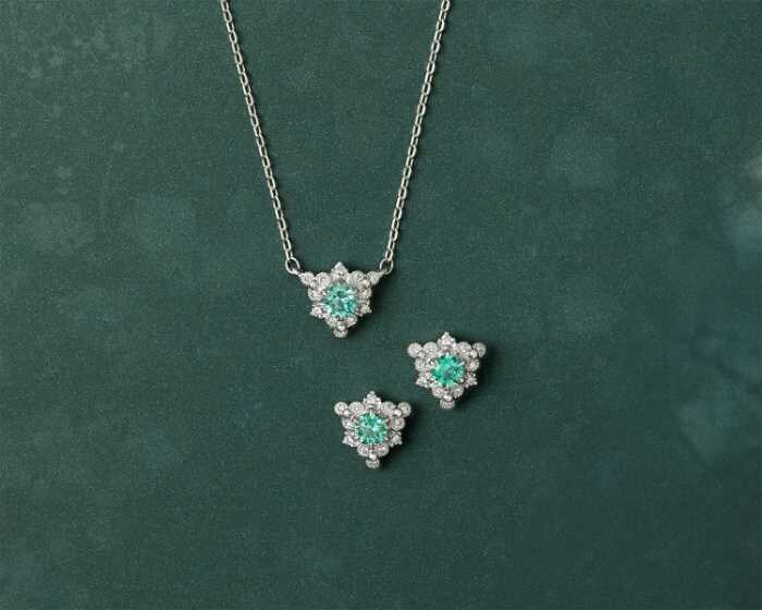“フルール・デクラ”シリーズからは、レアストーンジュエリーも登場。