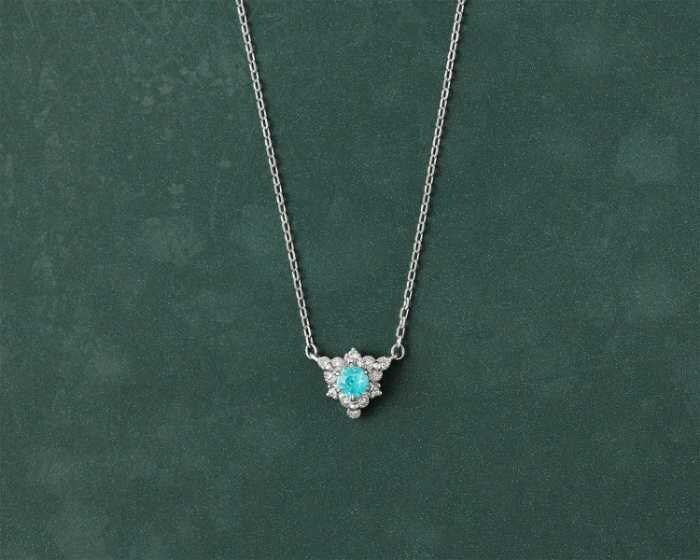 Pt Diamond Emerald Necklace(253,000円)や、アベリ直営店限定のPt Diamond Paraiba Tourmaline Necklace(308,000円)。