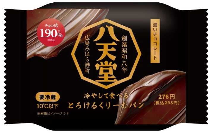 ファミリーマート限定「八天堂 冷やして食べる とろけるくりーむパン 濃いチョコレート」は、チョコレートの使用量を190%(※)増やし、まるでチョコレートをそのまま味わっているような贅沢感を目指して開発されました。