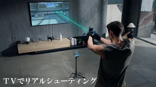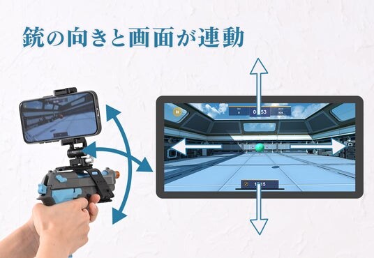 スマートフォンの画面が銃の動きとリンクして画面が移動し、ターゲットを撃ち抜きます。