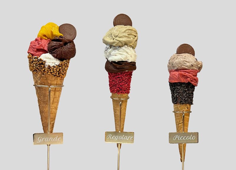 チョコレートスプレッドの上から細かいチョコレートやナッツをまとわせたグルメコーンに、もったりとした質感のジェラート、そしてトップに乗ったコイン型のチョコレート。ヴェンキのジェラートと推定できる形状です。