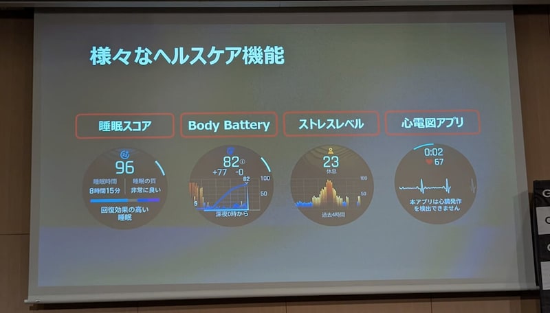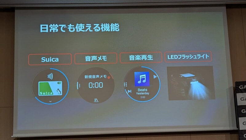 MIL-STD-810Gに準拠したミリタリースペックで耐熱、耐衝撃、防水(10ATM)に対応。心拍数、呼吸数、歩数、消費カロリー、血中酸素トラッキング、体のエネルギー状態を数値化するBody Battery、ストレススコア、睡眠スコア、フィットネス年齢の計測といったヘルスモニタリング機能を搭載します。日々の心拍変化を記録・分析し、心房細動の兆候が見られた場合にアラートを出す心電図アプリも搭載。フィットネス機能はランニング、サイクリング、筋トレ、ヨガ、水泳、ゴルフなど100種類の内蔵スポーツアプリによりトレーニングをサポートします。日常に役立つ機能として、スマートフォンとのペアリングによる通知機能、音楽再生機能、Suica対応のキャッシュレス決済に対応し、LEDフラッシュライトを搭載します。