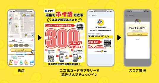 本取り組みでは、ドン・キホーテ 池袋東口駅前店、ドン・キホーテ 錦糸町北口店、ドン・キホーテ 中野駅前店の3店舗を対象に、『プラリー』上でプレミアムチェックインスポットとして展開します。各店舗のチェックインスコアを通常の約20倍にあたる300スコアに設定し、店内に設置された二次元コードを読み取ることでチェックインが完了する仕組みです。