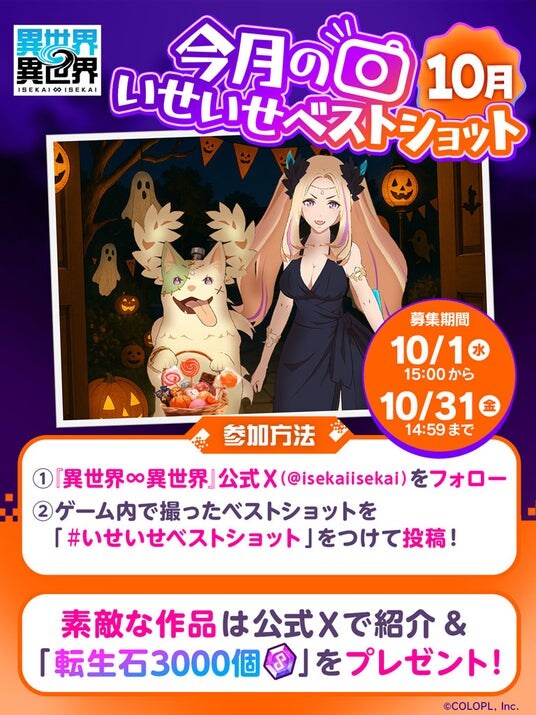 『異世界∞異世界』の公式X(https://x.com/isekaiisekai)をフォローして、ゲーム内で撮ったベストショットを #いせいせベストショットをつけて投稿しましょう!ベストショットに選ばれた方には転生石3,000個をプレゼントいたします。