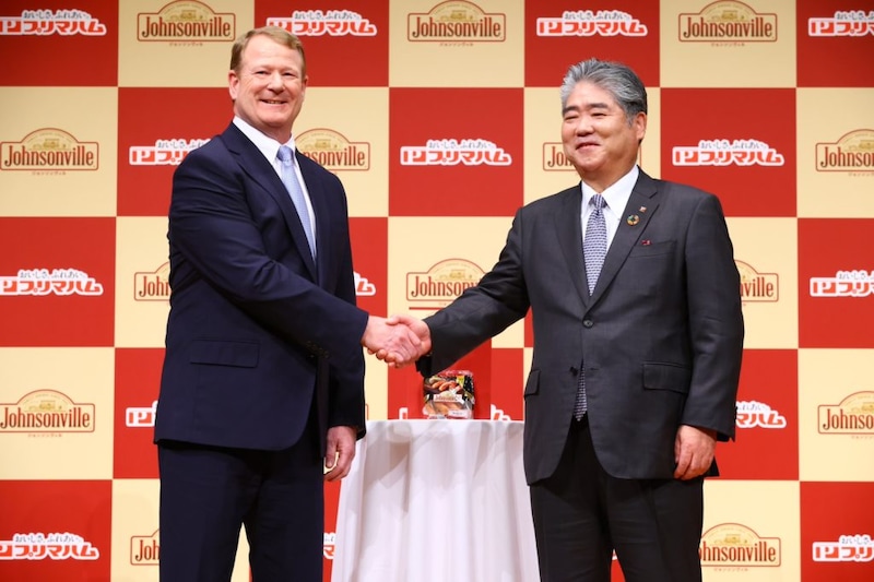 都内で行われた新商品発表会には、プリマハム株式会社の千葉尚登社長と、Johnsonville, LLCのボブ・フィッツジェラルド社長が登壇。