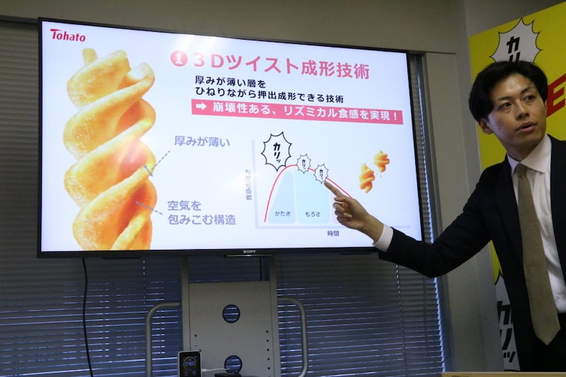 ツイストされた部分の厚みが約1.5ミリで、溝の部分に空気を包み込みやすい構造をつくることで、食べ始めはカリッと軽快に、次に層が崩れていって、「カリッカリッ」とリズミカルな食感を生み出しています。