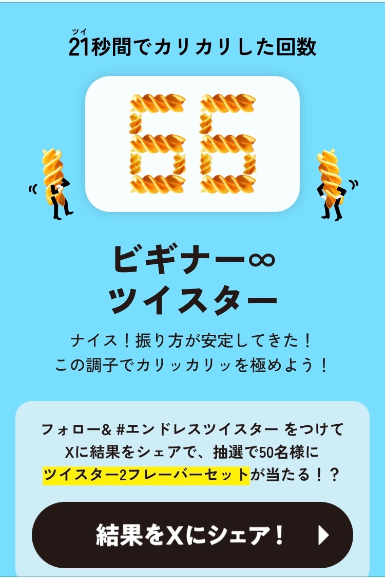 エンドレス∞ツイスターはツイスターの公式xアカウントをフォローして、ご自身のエンドレス∞ツイスターの結果をXでシェアすることで、ツイスターの2フレーバーセットを50名様に抽選でプレゼントするというもの。