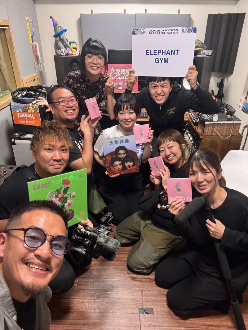 (左)「RUSH BALL台湾」台湾アーティスト・ゲシュタルト乙女Mikanさんと取材クルー、(右)「Elephant Gym」スタジオ取材での一コマ