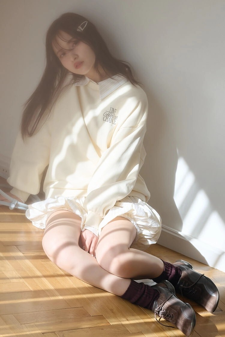 クリームカラーで女のコらしくしつつ、旬のバルーンミニでヘルシーな色気を盛れたら完璧★ ブラウンの足元で引き締めて。