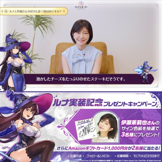 「ルナ」の実装を記念して、ルナ役を演じてくださった声優「伊瀬茉莉也」さんのインタビュー動画を公開中!また、「伊瀬茉莉也」さんのサイン色紙がもらえるキャンペーンも開催中です。『ゴッデスオーダー』公式Xをフォローした状態で、該当キャンペーンポストをリポストして是非ご参加ください。