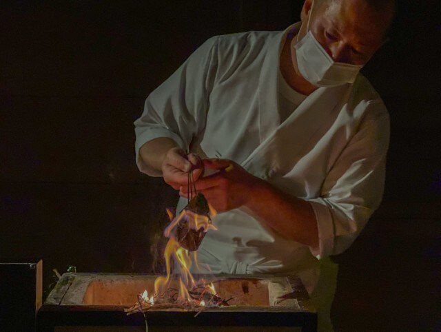 日本料理「溜ル」/近江牛を藁焼きする様子