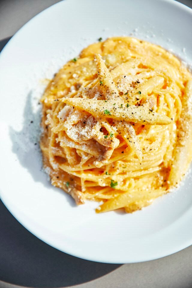 「京もち豚の自家製パンチェッタとホワイトアスパラガスのカルボナーラ」は、軽く炙ったホワイトアスパラガスの香ばしさとみずみずしさが濃厚なカルボナーラのアクセントに。どちらもボリューム満点なので、グループでシェアしていただくのがおすすめです!