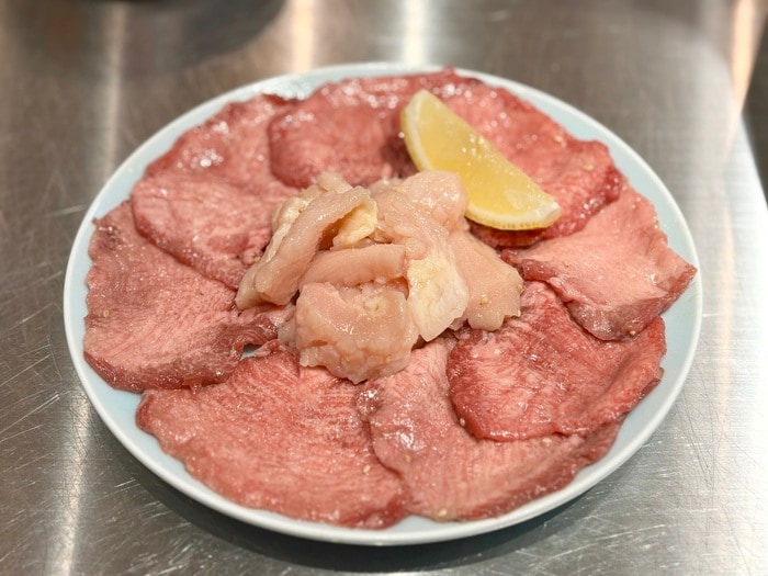 コリコリ食感の「上ミノ」とタンの1番柔らかい部分を使用。オーダーごとに特製ダレを揉み提供しています。