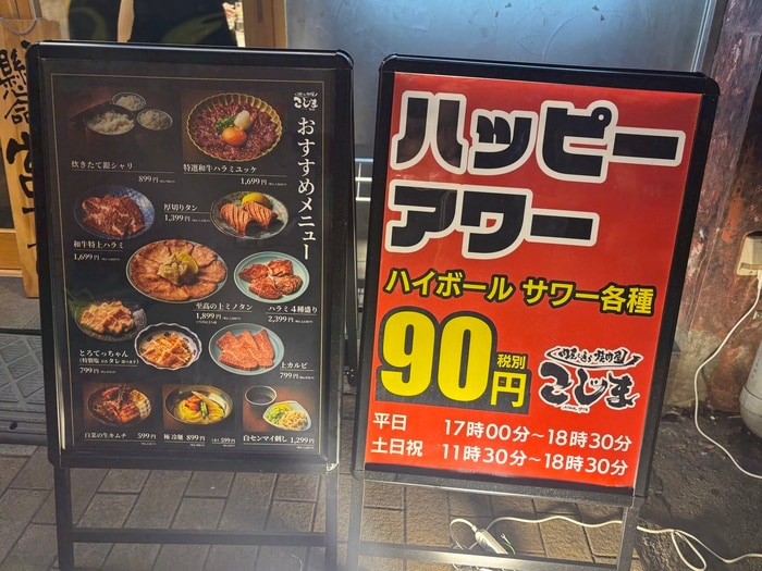入店前にまず目に飛び込んでくる看板には、ハッピーアワー・ハイボール・サワー各種なんと90円(税別)!平日は17:00から18:30、土日祝は11:30から18:30のお得すぎるサービスです。