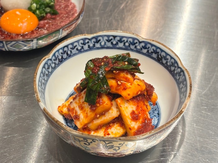 生で提供する「特選和牛ハラミユッケ」。新鮮だからこそ生でいただけるハラミは、卵黄・大根おろし・ネギが添えられており、食べると思わず笑みが溢れます。