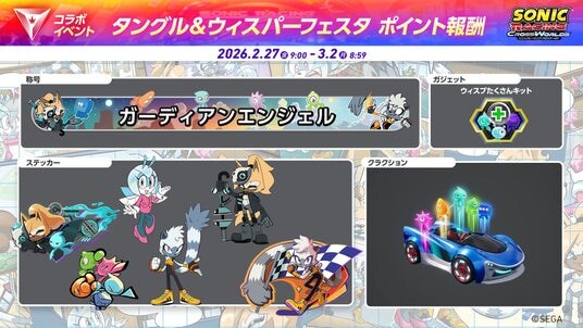 株式会社セガは、好評発売中の『ソニックレーシング クロスワールド』について、無料アップデート「タングル&ウィスパー」の配信を本日2026年2月26日(木)より開始しました。タングルとウィスパーは、IDWコミックシリーズ『ソニック・ザ・ヘッジホッグ』に登場するソニックの頼れる仲間で、陽気なキツネザルと寡黙なオオカミのキャラクターです。