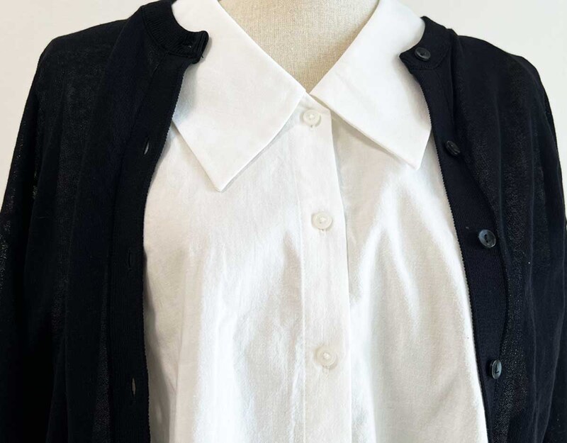 「襟が丸ではなく角なので、甘くなりすぎず首元がすっきりしてみえてよい」