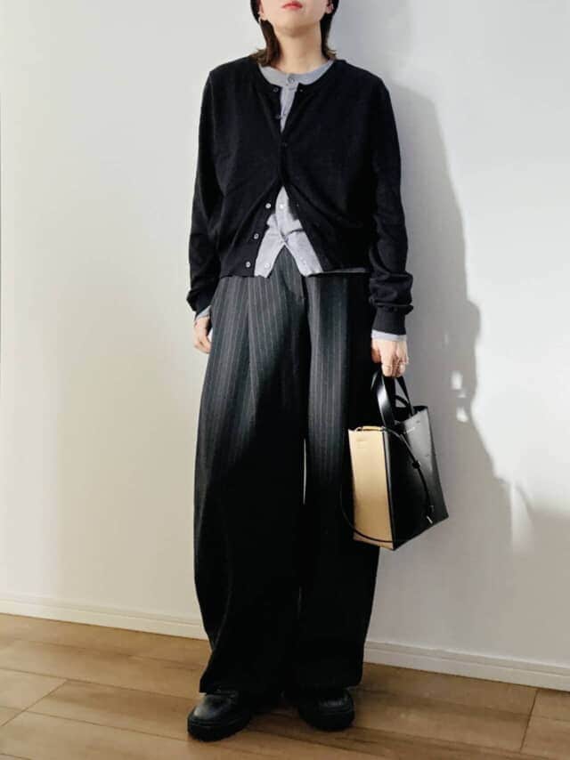 ストライプ柄を選べば縦ラインが強調され、さらにスマートな印象に。ボリュームのあるニットには、ややコンパクトなサイズ感を選ぶと全体にメリハリが生まれます。