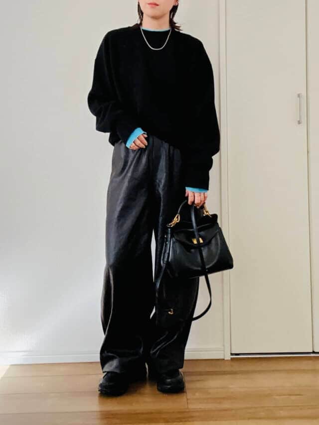 引き締め役の黒は頼れる存在ですが、全身同じ質感でまとめると重たく見えがち。そこで取り入れたいのが素材のコントラスト。柔らかな黒ニットにサテン調のパンツを合わせるだけで立体感が生まれ、春らしい軽さが加わります。