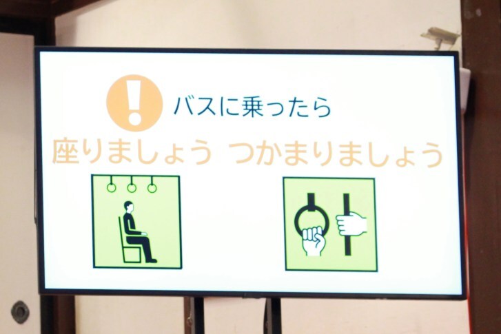 利用者向けの動画では、「バスに乗ったら座りましょう。つかまりましょう」と呼びかけている。
