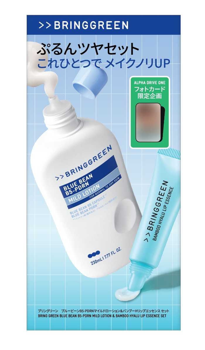 ブリングリーン独自の保湿成分「ブルービーンB5-PDRN™*¹」を配合した乳液とリップエッセンスに、フォトカードが付いた特別セット。