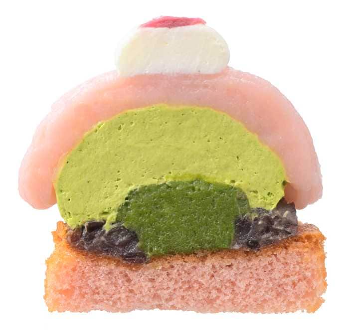 桜風味マドレーヌの上に粒あんと抹茶あんを重ね、ほどよい苦みの抹茶クリームを合わせて桜あんで包み込んだモンブランです。