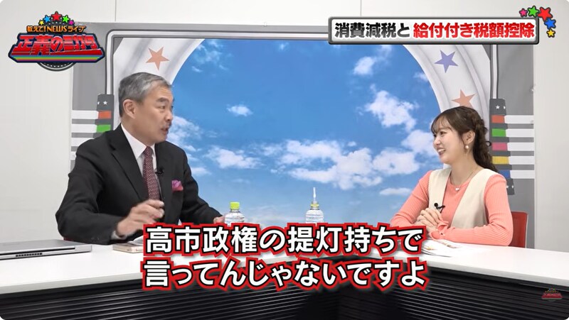 21日の「正義のミカタ」生放送では片山さつき財務大臣が生出演し、片山財務大臣にとって大蔵省(現・財務省)の2年先輩にあたる経済学者の髙橋洋一氏と競演。同じく大蔵省出身の国民民主党党首・玉木雄一郎氏もリモートで出演し、“財務官僚出身トリオ”が高市内閣の「責任ある積極財政」や「財務省悪玉論」について討論を繰り広げていた。