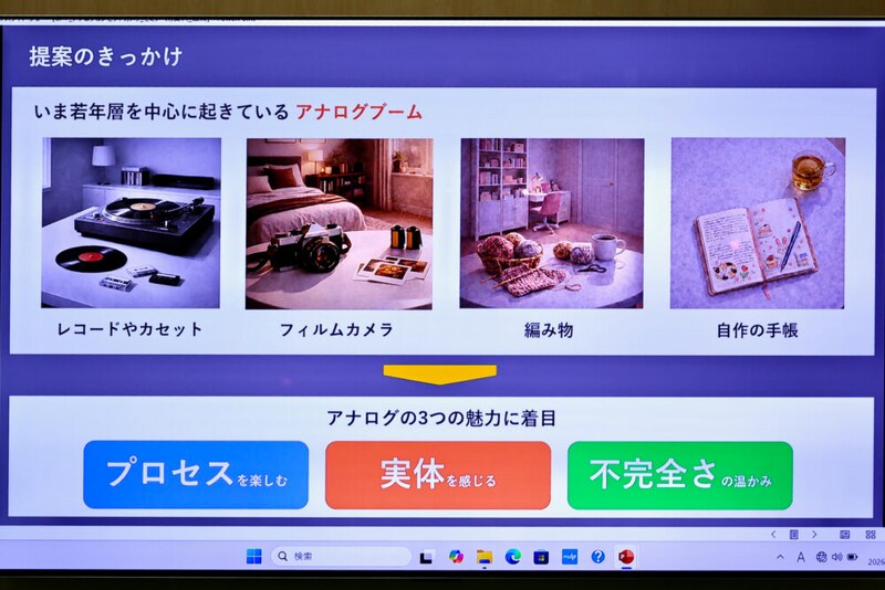 デジタル世代であるはずの若者たちが、レコードやカセットテープ、フィルムカメラ、編み物、あるいは自作の手帳といったアナログなものに惹かれる理由。その背景には、単なる結果だけではなくプロセスそのものを楽しむこと、確かな手触りや実体を感じること、そして不完全さがもたらす特有の温かみといった要素があるのではないかと分析したと言う。