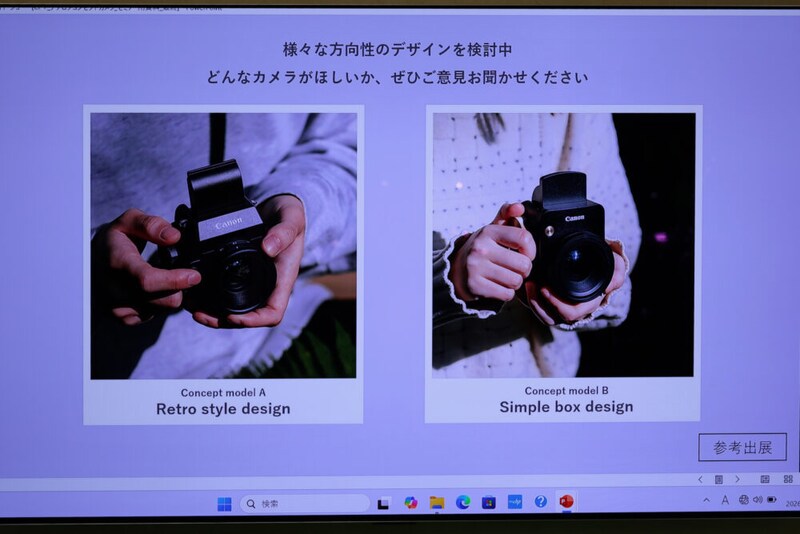デザインも模索中で、左のコンセプトモデルAはレトロな中判カメラ風のデザインになっている。一方、右のコンセプトモデルBはどちらかというと、現在のキヤノンのカメラのデザイン文法に近い、機能をストレートにシンプルな形に表したデザインなのだそうだ。