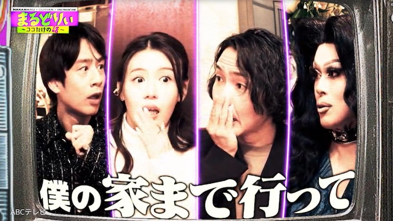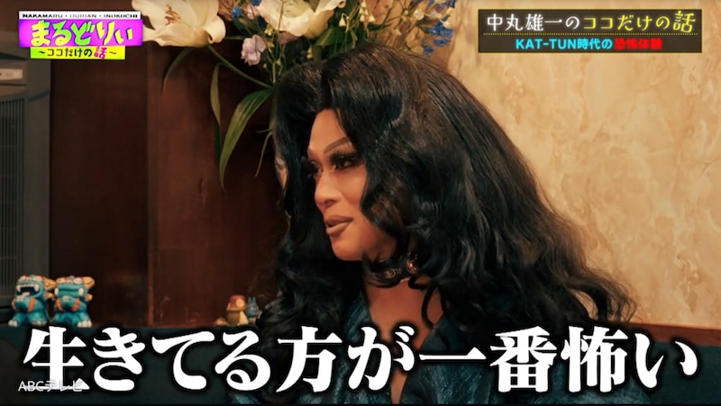 「……っていう、結構震え上がった出来事がありました」と中丸が話し終えると、スタジオ一同があ然。ドラァグクイーンのドリアン・ロロブリジーダが、「やっぱり生きている方が一番怖い」「その方も生きてらっしゃる方?」とたずねると、中丸は「生きてました。足元ハッキリしていたんで」と答え、スタジオを笑いで包んだ。