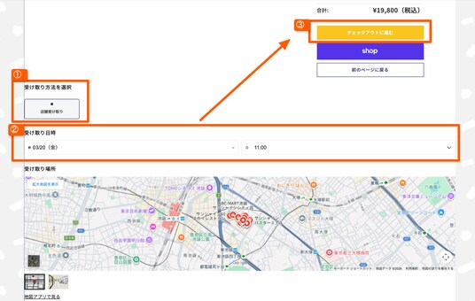 カート画面内の「受取方法を選択」設定から、受取日(カレンダー)/受取時間(時間枠)を選択してください。 ご希望の受取日時・場所を指定したら、カート画面からチェックアウト(購入)へ進みます。