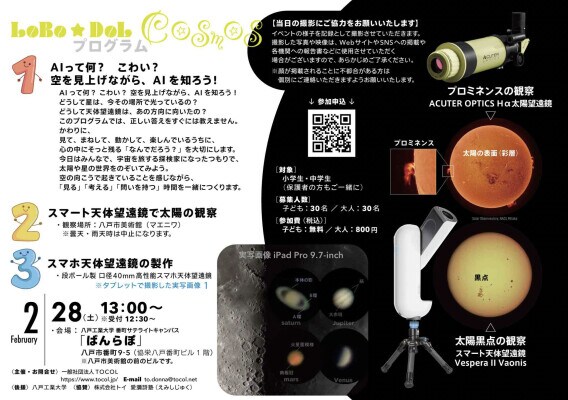 本ワークショップは、同法人が展開するロボット教育・ROBO☆DOL DANCE(ロボット×表現×テクノロジー)の学びの流れの一環として実施されるもので、「ロボットはどうやって世界を見ているのか」という問いを、天体観測を通して体験的に学ぶ内容となっています。