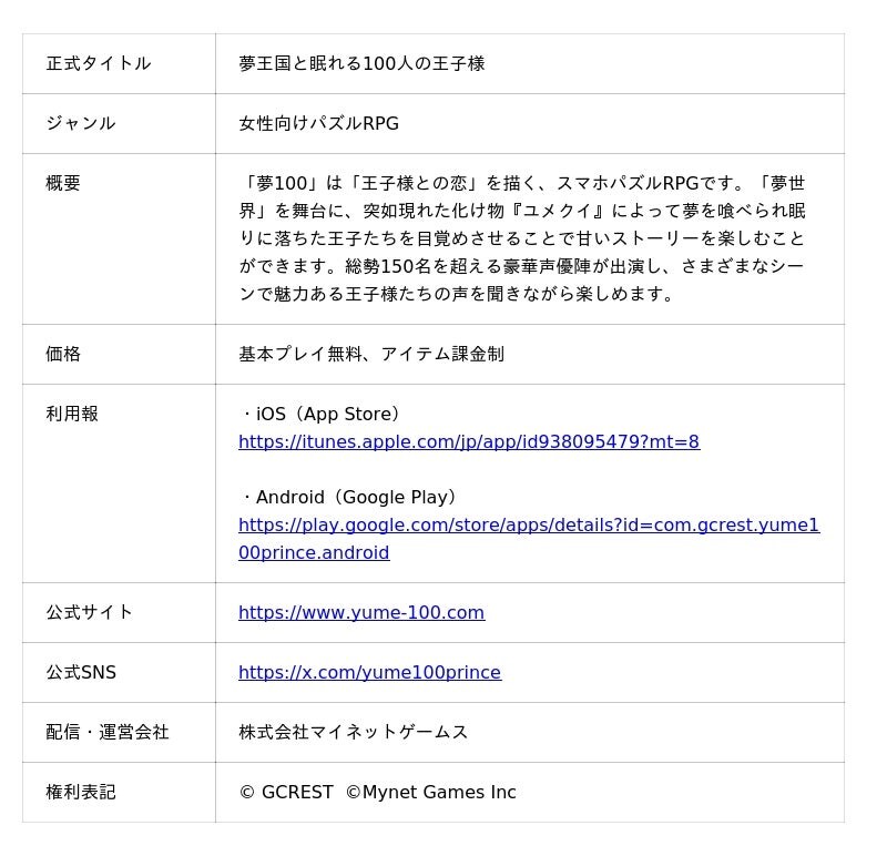 スマートフォン向けゲームの運営・開発を行う株式会社マイネット(東京都港区、代表取締役社長:岩城 農)は、子会社の株式会社マイネットゲームス(東京都港区、代表取締役社長:岩城 農)が運営する『夢王国と眠れる100人の王子様』 (以下、『夢100』) が、2026年3月9日(月)に11周年を迎えることをお知らせいたします。これを記念し、アニバーサリーキャンペーンを開催いたします。