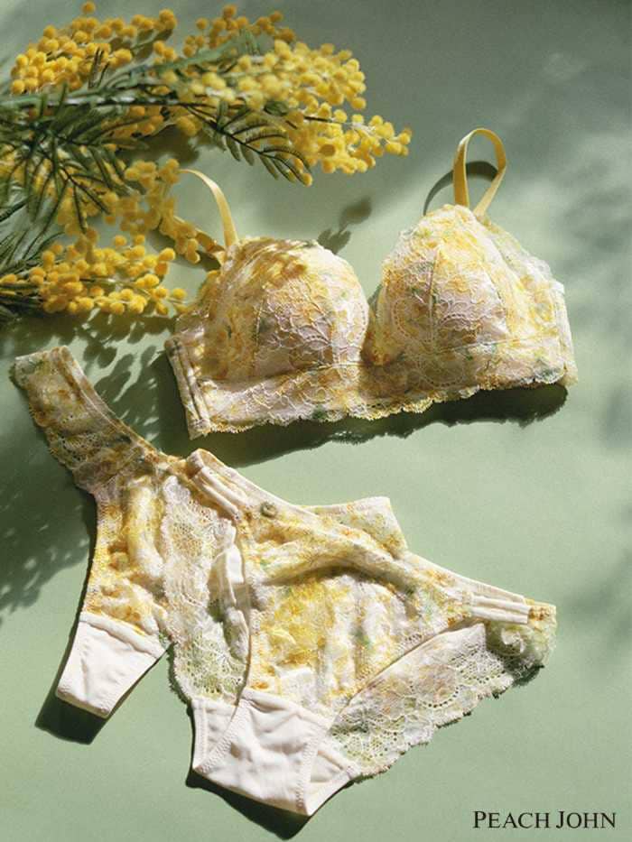 透け感のある編み柄とサテン調素材のコントラストが美しいストレッチラッセルレースを使用した「ナイスバディブラ」に、新色ミモザとサクラが加わりました。