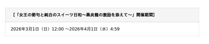 【期間】2026年3月1日(日)12:00頃 ~ 2026年3月13日(金)12:00頃まで