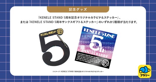「KENELE STAND 5周年記念オリジナルカラビナ&ステッカー」、または「KENELE STAND 5周年サンクスギフト&ステッカー」のいずれか1種類が当たります。