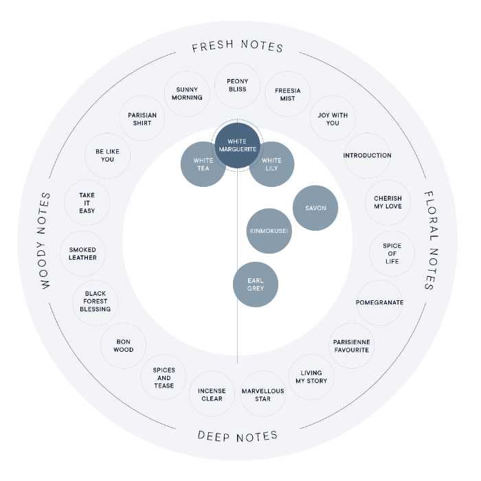 「ホワイトマーガレット」は、爽やかなグレープフルーツやフレッシュなカシスの果実感に、透明感のあるフローラルを重ねた軽やかな香り。